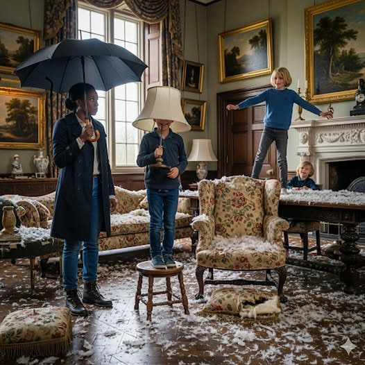 Belinda Johnson stood frozen in the doorway of the Whittaker Mansion, watching three six-year-old boys transform the elegant living room into a war zone. Paint splattered the white walls, expensive furniture was overturned, and feathers from torn pillows floated in the air like snow. But what shocked her most wasn’t the destruction, but the pain in their eyes.