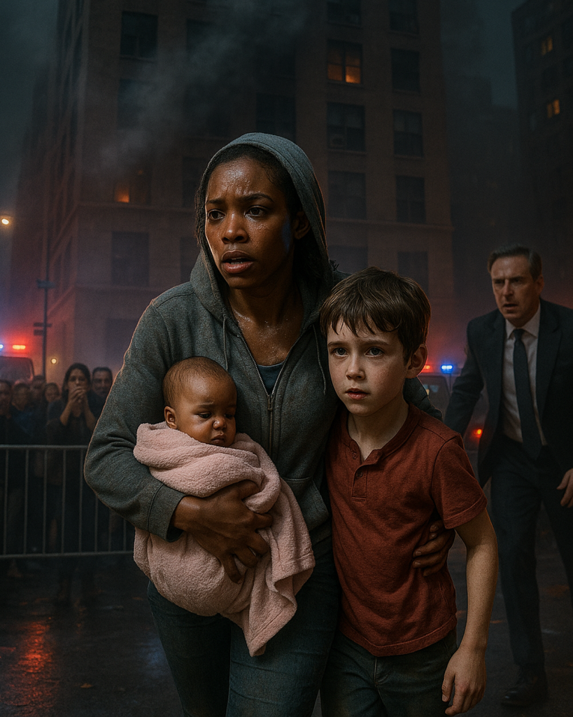 At last, the door at the ground floor burst open. The crowd outside gasped as Aisha stumbled out, clothes blackened, hair drenched in sweat, carrying her baby while Ethan clung to her.