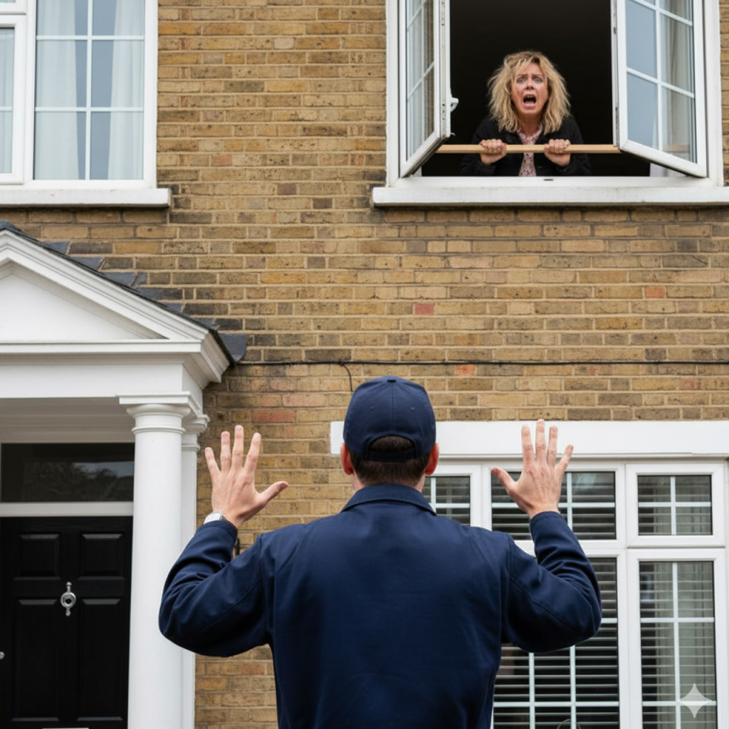 The courier noticed a woman at the window shouting something: he was horrified when he realized what she was actually saying