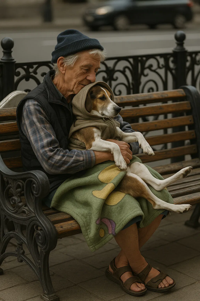The next morning, they were there again. Same bench, same blanket, same embrace. The man, weathered but calm. The dog, wrapped up like a baby. It became a routine. Each morning as I hurried past, there they were, sharing the quietest kind of love I’d ever witnessed.