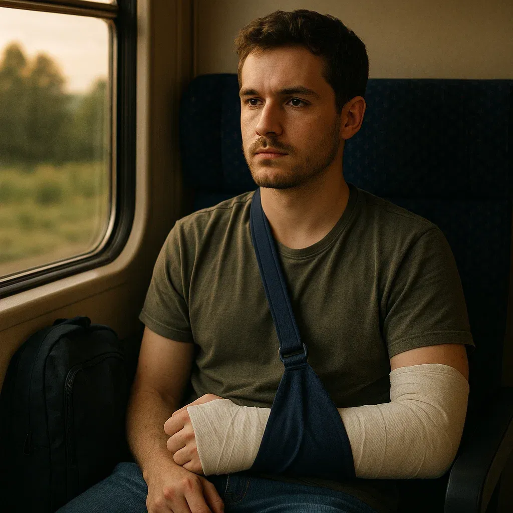 The platform buzzed with voices and rolling suitcases as the train hissed and lurched forward. Daniel, already in his spot, let out a soft sigh of relief. His backpack rested beside him, his sling secured, and his head leaned gently against the window. The hum of the train on the tracks offered a sort of lullaby—a promise of quiet.