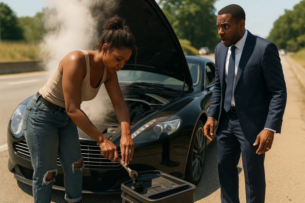 As he paced back and forth, kicking at the gravel on the side of the road, he heard the slow rumble of an older pickup truck pulling up behind him. It was a faded red Ford F-150, dented and dusty but steady. From the driver’s side, a Black woman in her mid-thirties stepped out. She wore a simple tank top, ripped jeans, and work boots. Her hair was tied up in a messy bun, and a streak of grease stained her cheek.