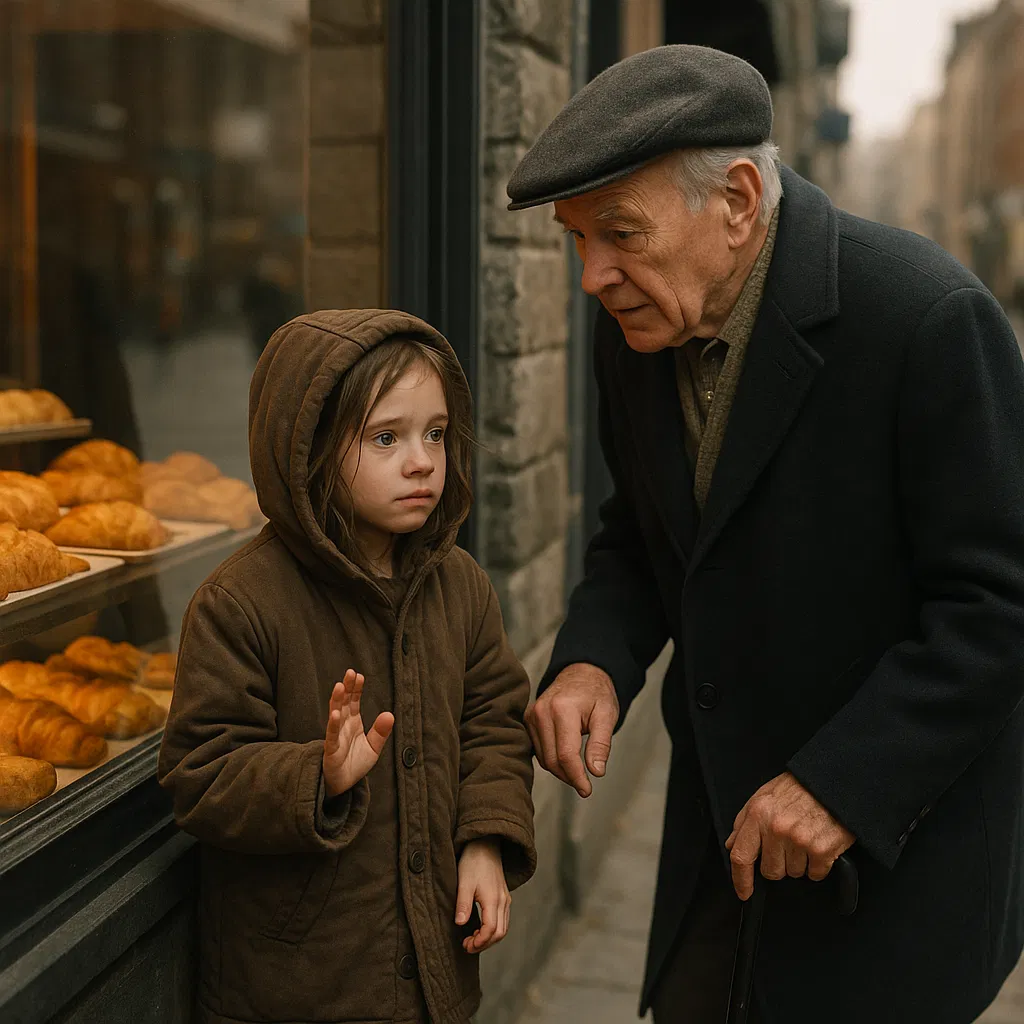A little girl, no older than eight, stood alone at the edge of the sidewalk, her nose nearly pressed to the glass of a bakery window. Her coat was torn. Her shoes were soaked. And her wide brown eyes—eyes that should have sparkled with joy—were fixed silently on the tray of pastries inside.