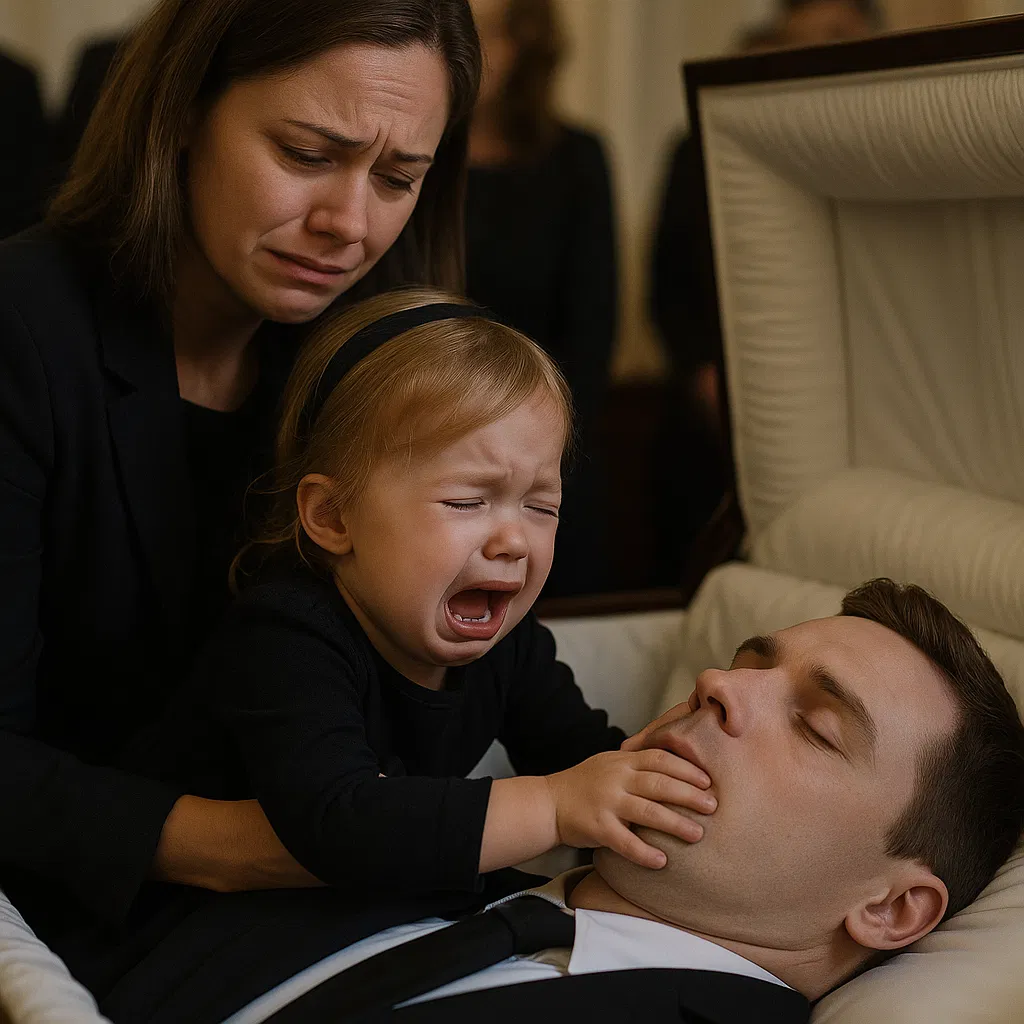 A family friend gently lifted Lily so she could peer into the coffin. Her little hands clung to the edge of the casket as she studied her father’s face. Her lips trembled slightly. At first, she was silent. Then, her tiny voice filled the air, breaking the fragile silence like shattered glass.
