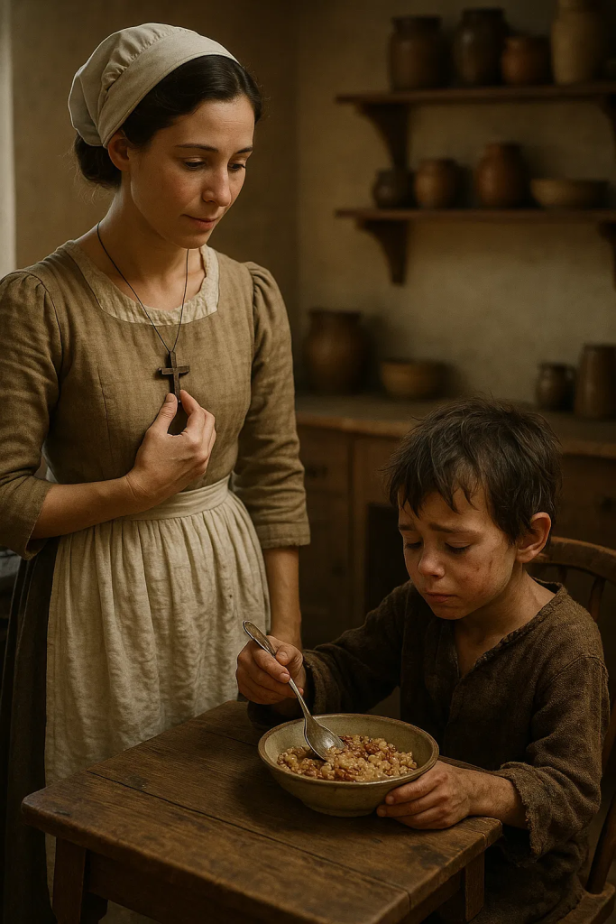 He stepped forward hesitantly, his bare feet silent on the stone path. Maria guided him to the kitchen, where the warmth of the stove welcomed them both. She sat him gently on a small wooden chair beside the pantry and placed the warm bowl in front of him.