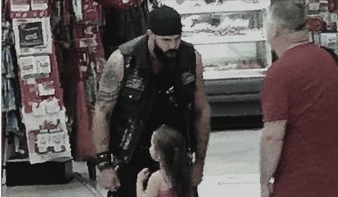 All because one six-year-old girl recognized that the scariest-looking person in Walmart might just be the safest person she could run to.