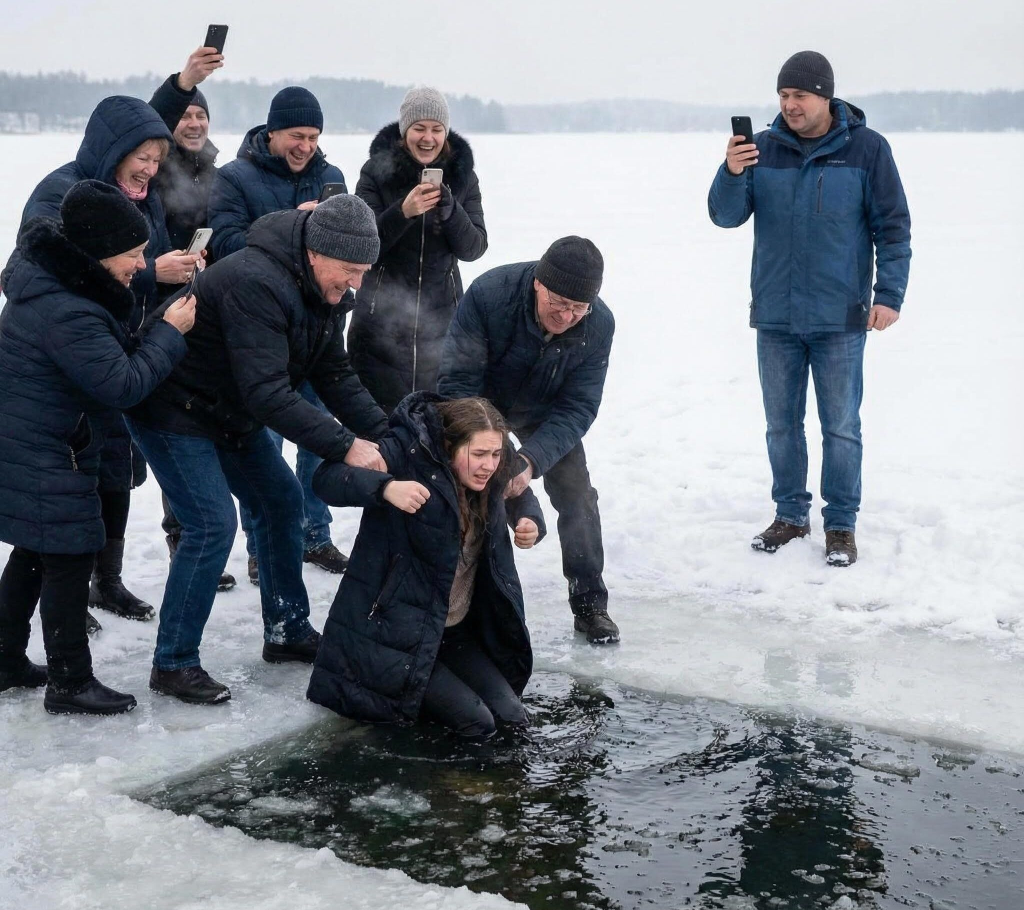 Finally—finally—an older man pushed through, reached down, and hauled Emily out. She collapsed onto the ice, gasping, shaking violently, unable to speak.