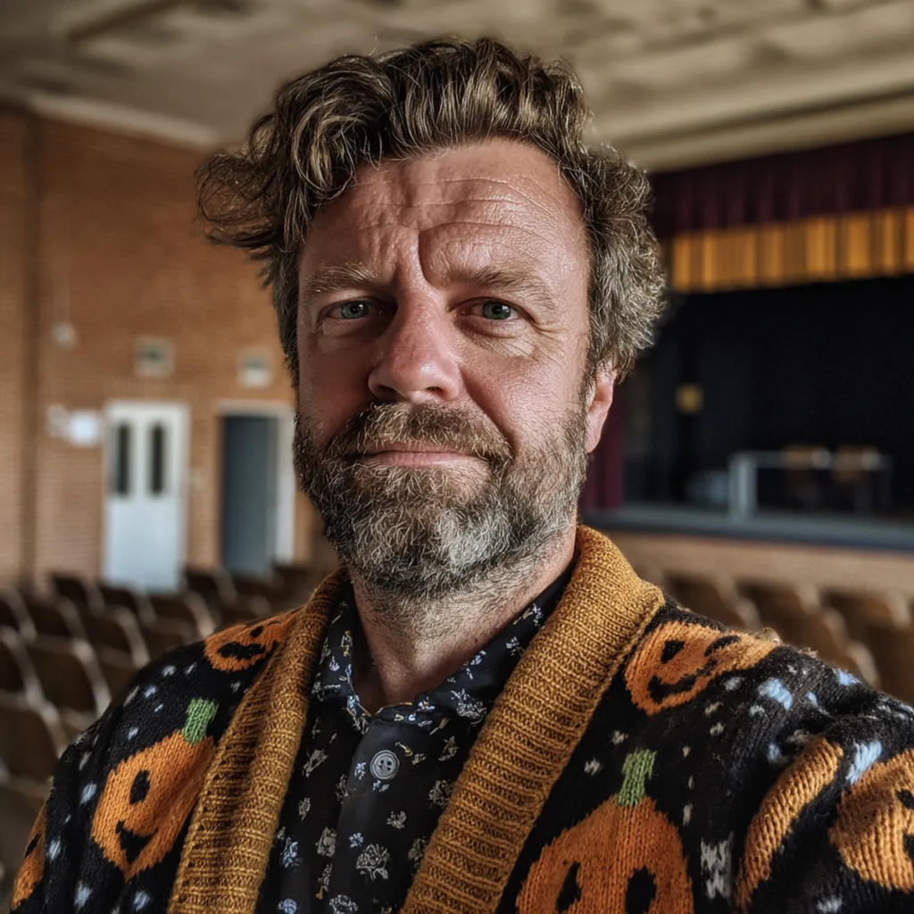 A smiling man wearing a pumpkin cardigan | Source: Midjourney