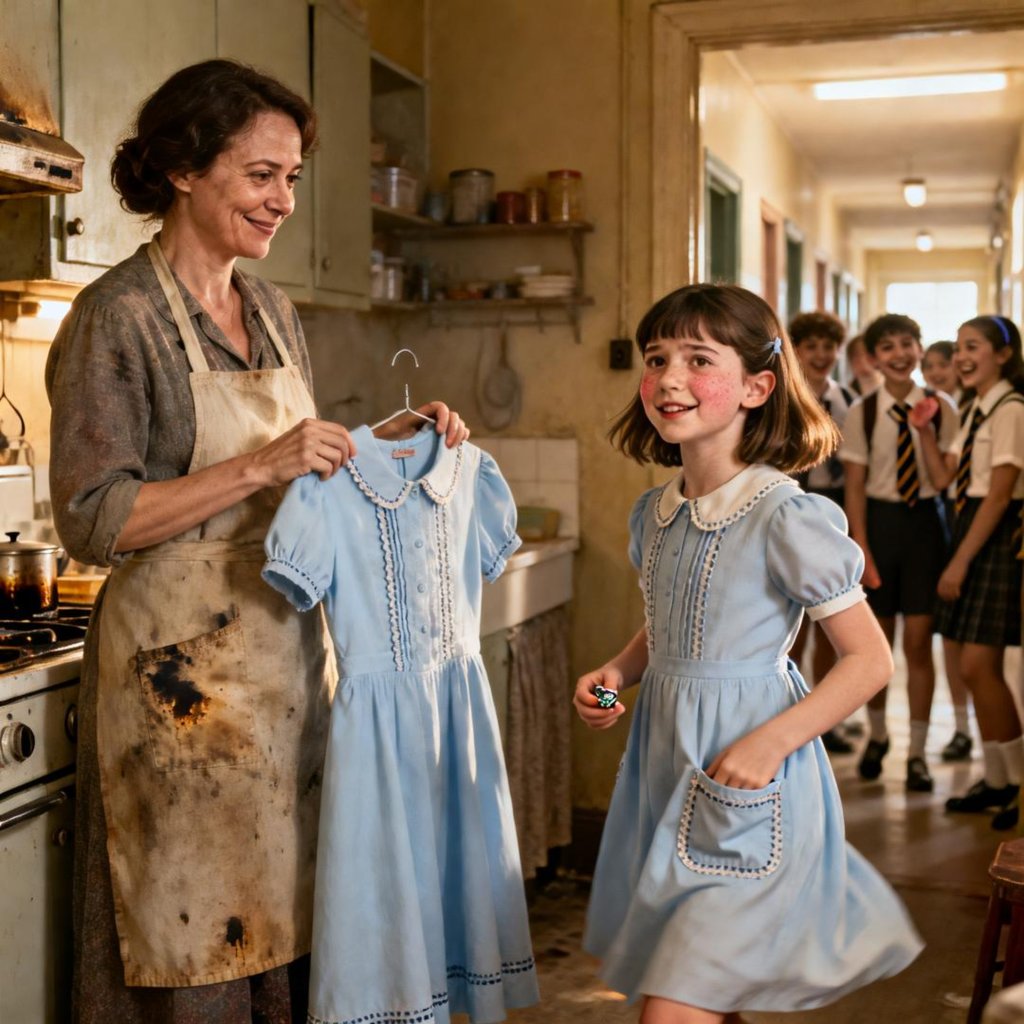 Inside was the most beautiful dress I had ever seen. Pale blue, soft fabric, delicate stitching—something you’d expect to see in a movie, not in our cramped apartment. It looked expensive. It looked impossible.