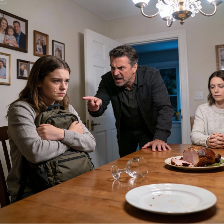 I turned to my mother, desperate for her to say something—to tell him to stop, to tell me to stay. But she just sat there, hands folded neatly in her lap, eyes fixed on her plate. When she finally spoke, her voice was so quiet I almost missed it. “Maybe it’s best if you go,” she said.