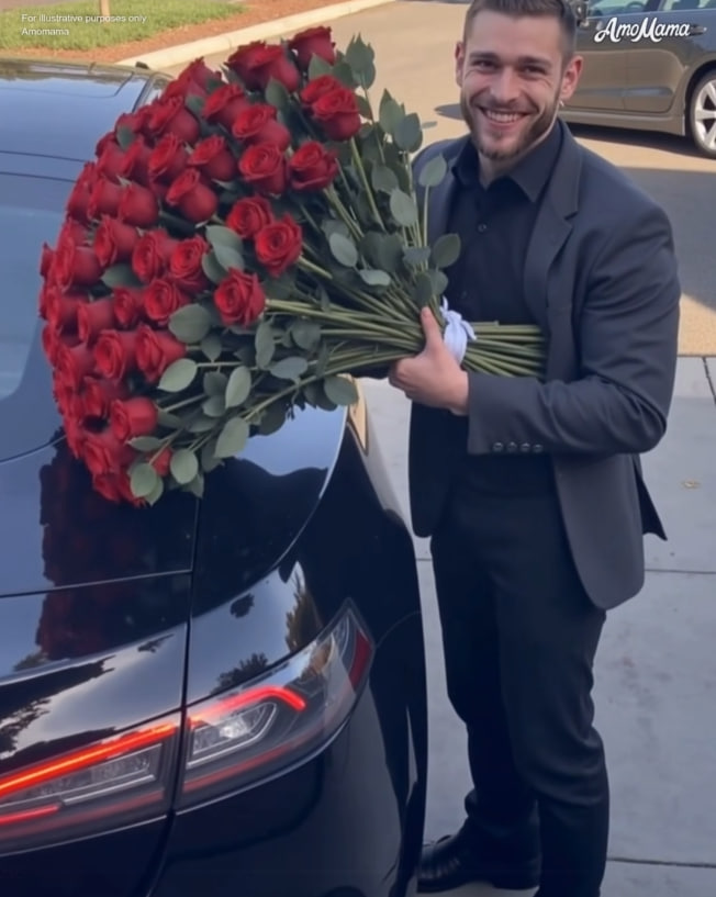 He grinned, holding out a bouquet of deep red roses. “Happy anniversary, babe.”
