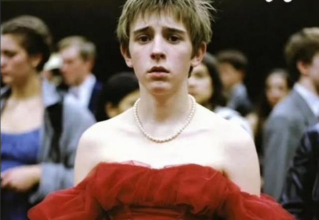 Liam entered through the double doors wearing a flowing red dress that shimmered under the auditorium lights.