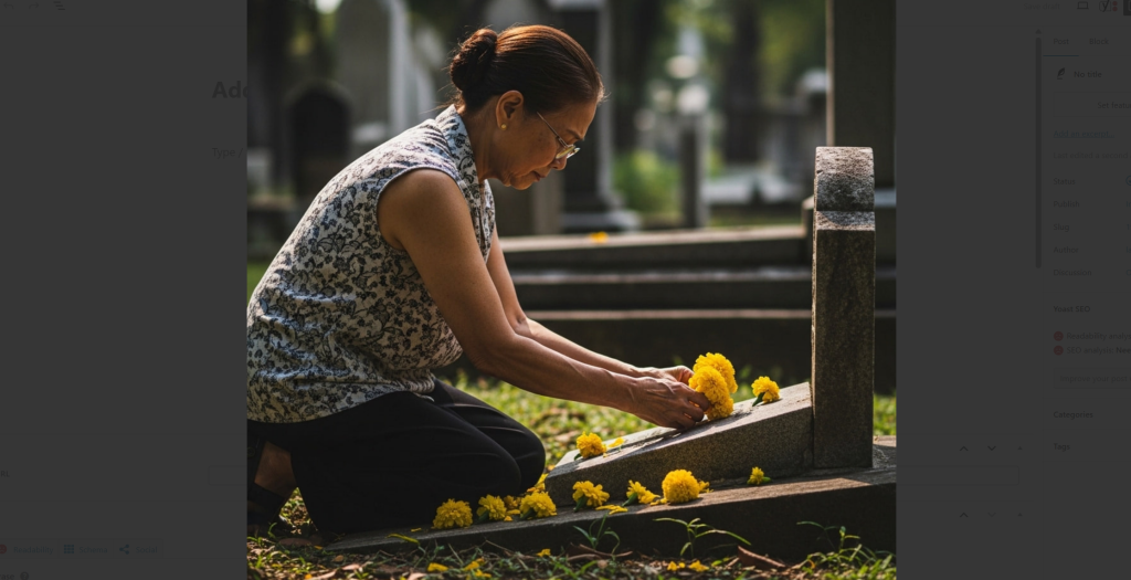 She got out of the taxi, her gaze fixed on the gate, and turned to the driver. “Please wait here… I won’t be long.” With a deep, painful sigh, Brenda entered the cemetery, flowers in hand.