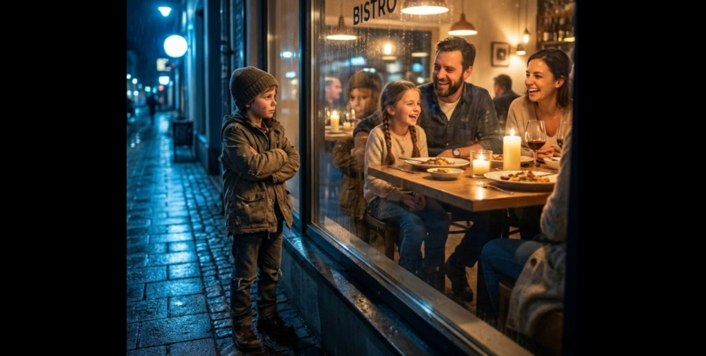 The restaurant was warm, glowing with soft lights and quiet laughter. It smelled like food I rarely got to eat. I remember standing near the entrance while they went inside, watching through the glass as they took their seats. I told myself it wouldn’t be long. I told myself she’d come back for me. Children are good at lying to themselves when the truth feels too dangerous.